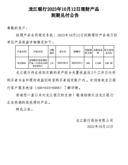 龙江银行2023年10月12日理财产品到期兑付公告