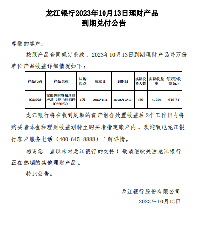 龙江银行2023年10月13日理财产品到期兑付公告