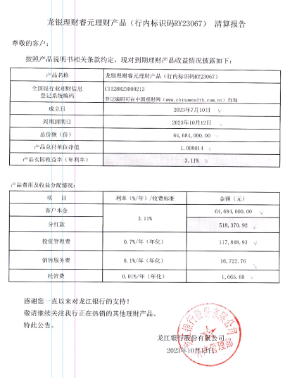 龙银理财睿元理财产品(行内标识码RY23067)清算报告