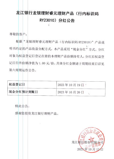 关于龙银理财睿元理财产品(行内标识码RY23010)分红公告