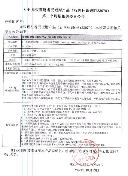 关于龙银理财睿元理财产品(行内标识码RY23070)第二个周期相关要素公告