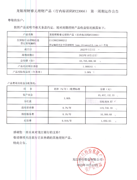 龙银理财睿元理财产品(行内标识码RY23066)第一周期运作公告
