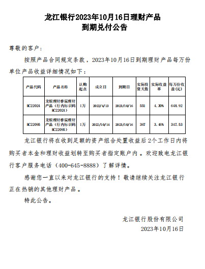 龙江银行2023年10月16日理财产品到期兑付公告