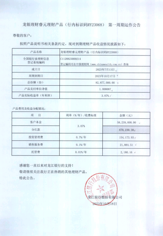 龙银理财睿元理财产品(行内标识码RY23068)第一周期运作公告