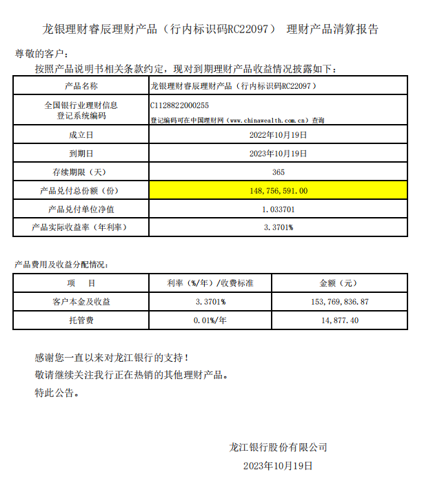 龙银理财睿辰理财产品RC22097号理财产品清算报告