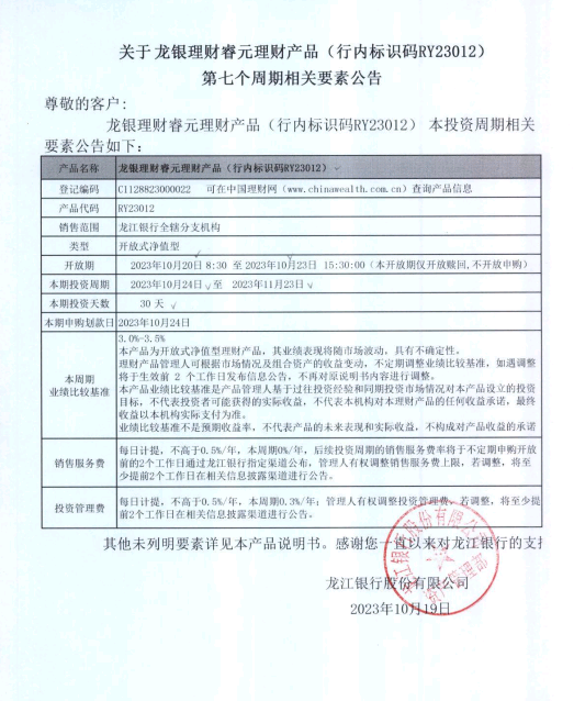 龙银理财睿元理财产品(行内标识码RY23012)第七个周期相关要素公告