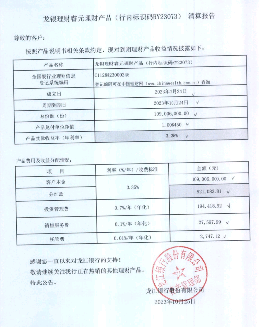 龙银理财睿元理财产品(行内标识码RY23073)清算报告