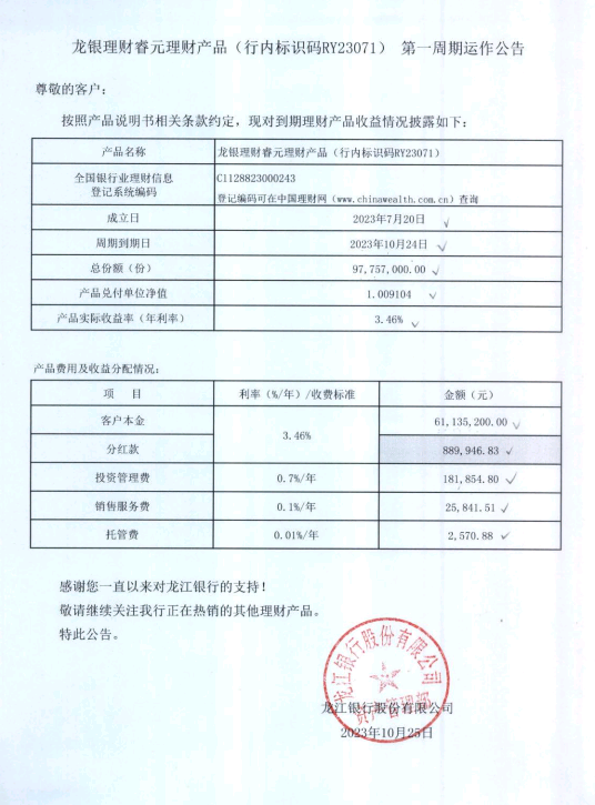 龙银理财睿元理财产品(行内标识码RY23071)第一周期运作公告