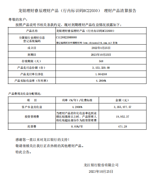 20231025龙银理财睿辰理财产品RC22030号理财产品清算报告