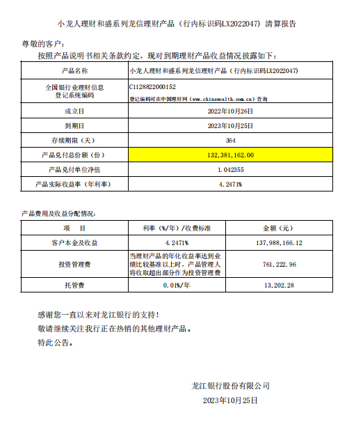 20231025小龙人理财和盛系列龙信理财产品LX2022047清算报告