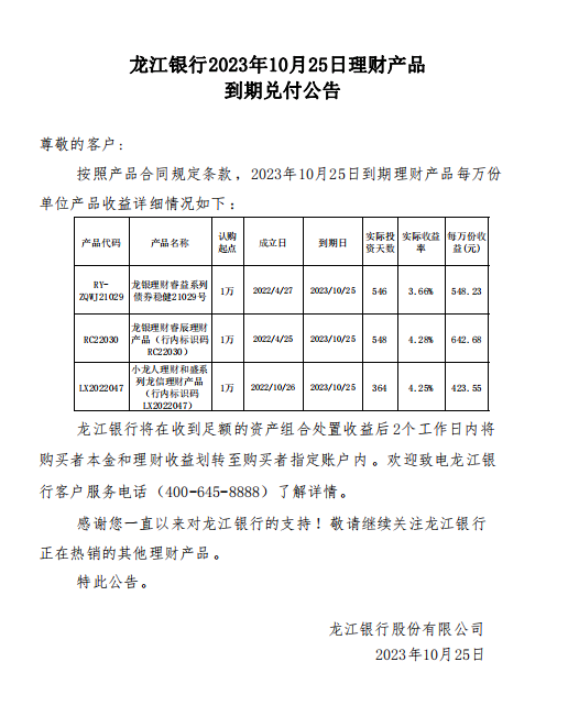龙江银行2023年10月25日理财产品到期兑付公告