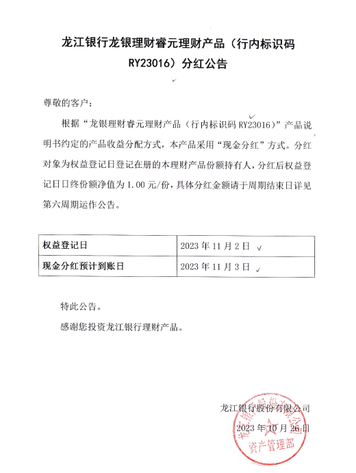 关于龙银理财睿元理财产品(行内标识码RY23016)分红公告