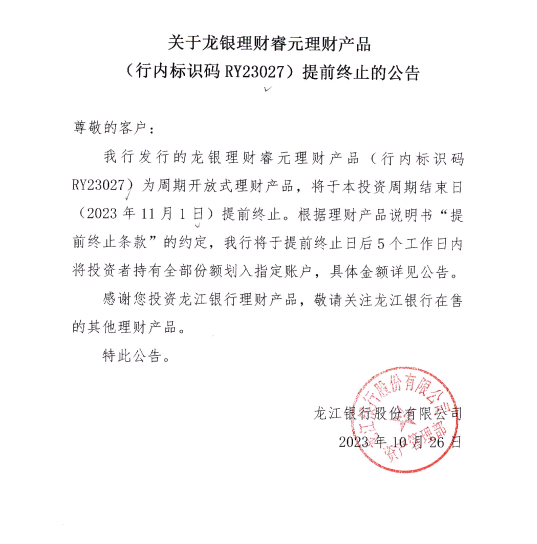 关于龙银理财睿元理财产品(行内标识码RY23027)提前终止的公告