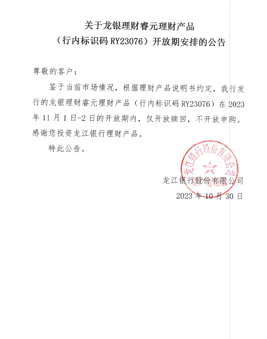 关于龙银理财睿元理财产品(行内标识码RY23076)开放期安排的公告