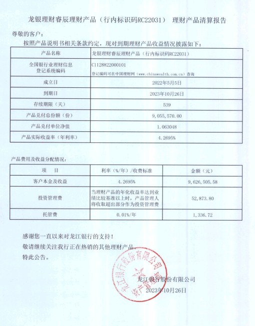龙银理财睿辰理财产品(行内标识码RC22031)清算报告