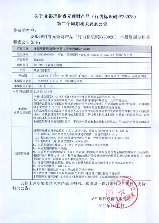 龙银理财睿元理财产品(行内标识码RY23028)第二个周期相关要素公告
