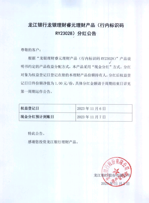 龙银理财睿元理财产品(行内标识码RY23028)分红公告