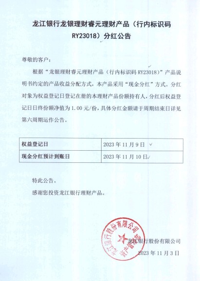 龙江银行龙银理财睿元理财产品(行内标识码RY23018)分红公告