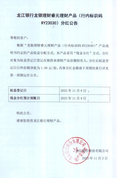 龙江银行龙银理财睿元理财产品(行内标识码RY23030)分红公告