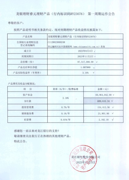 龙银理财睿元理财产品(行内标识码RY23076)第一周期运作公告