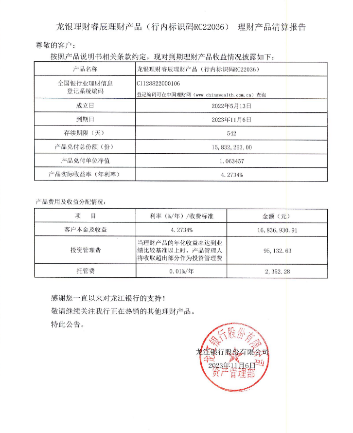龙银理财睿辰理财产品(行内标识码RC22036)理财产品清算报告