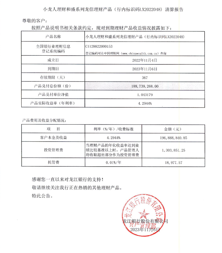 小龙人理财和盛系列龙信理财产品(行内标识码LX2022048)清算报告