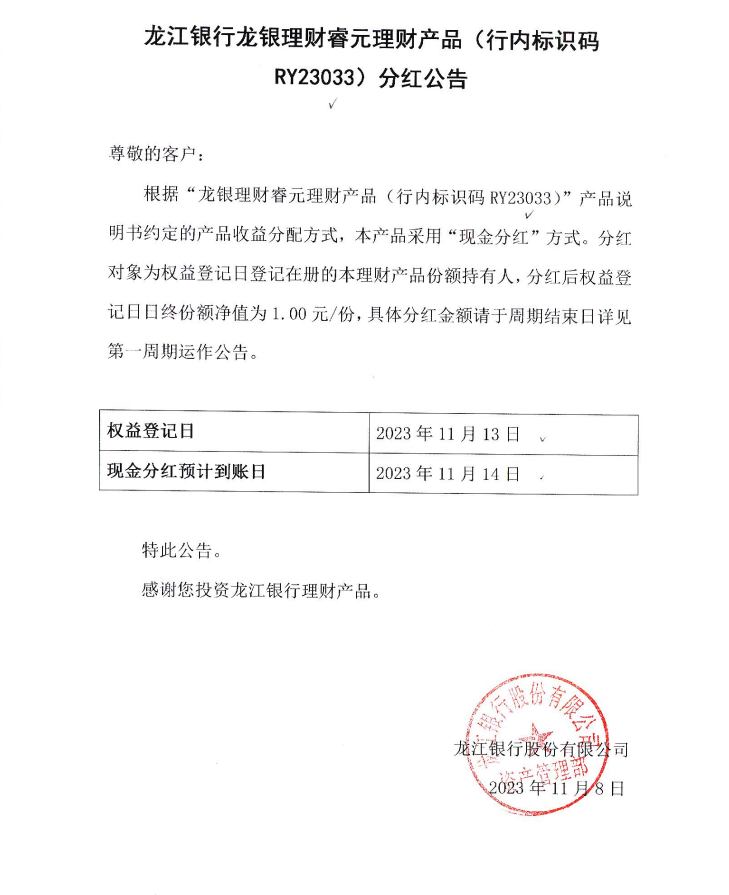 龙银理财睿元理财产品(行内标识码RY23033)分红公告