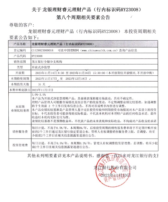 关于龙银理财睿元理财产品(行内标识码RY23008)第八个周期相关要素公告