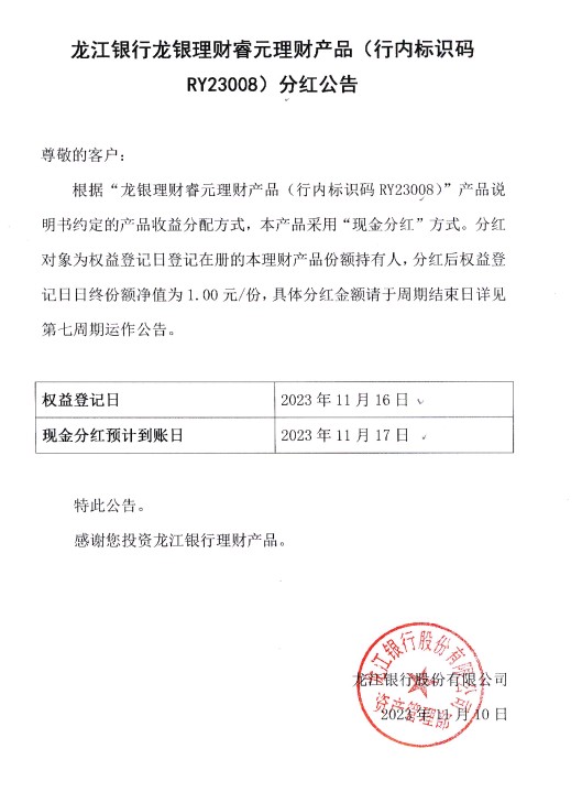 关于龙银理财睿元理财产品(行内标识码RY23008)分红公告