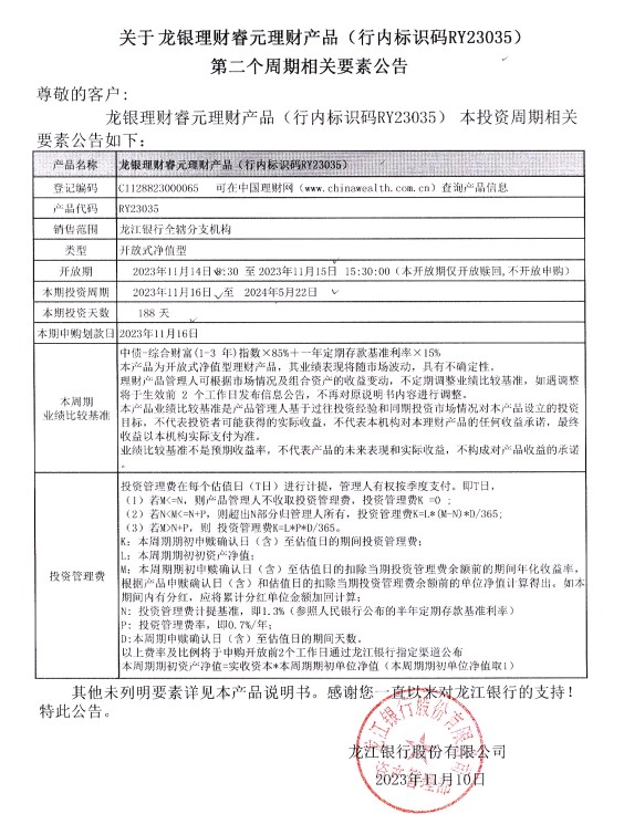关于龙银理财睿元理财产品(行内标识码RY23035)第二个周期相关要素公告