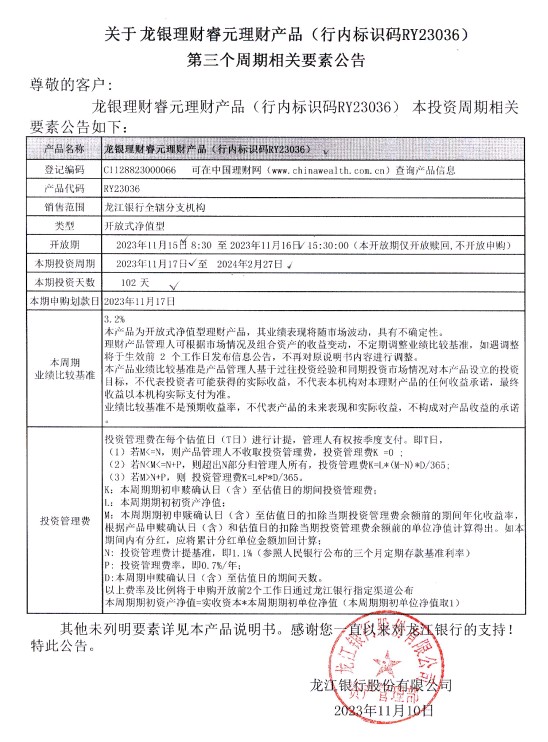 关于龙银理财睿元理财产品(行内标识码RY23036)第三个周期相关要素公告