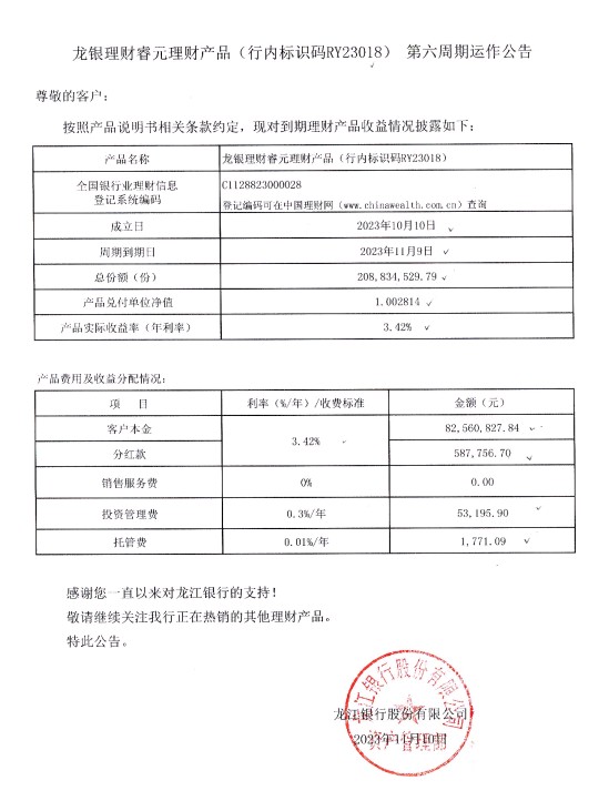 龙银理财睿元理财产品(行内标识码RY23018)第六周期运作公告