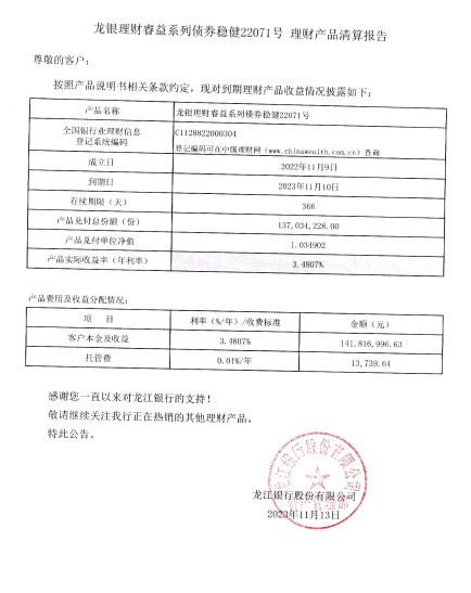 龙银理财睿益系列债券稳健22071号理财产品清算报告