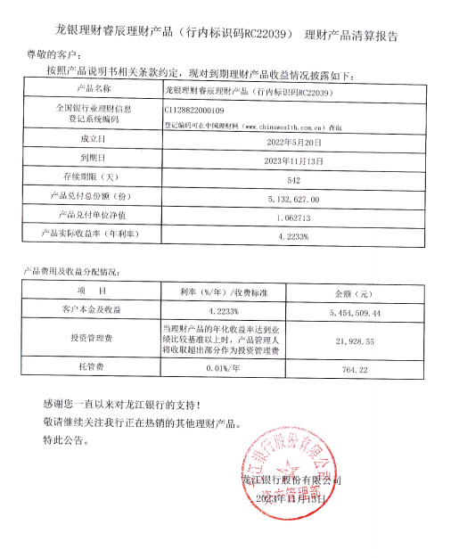 龙银理财睿辰理财产品(行内标识码RC22039)理财产品清算报告