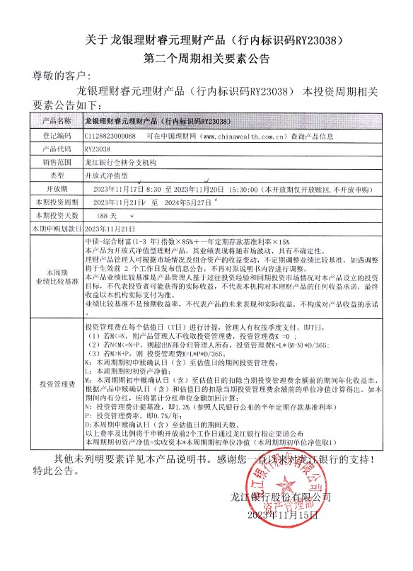 关于龙银理财睿元理财产品(行内标识码RY23038)第二个周期相关要素公告