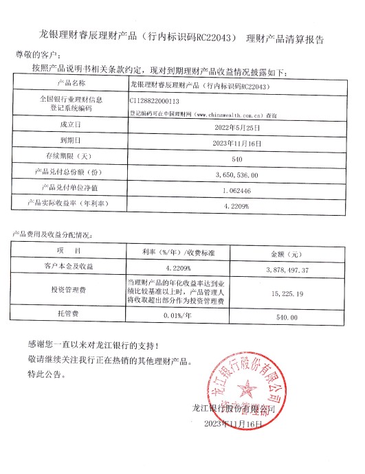 龙银理财睿辰理财产品(行内标识码RC22043)理财产品清算报告