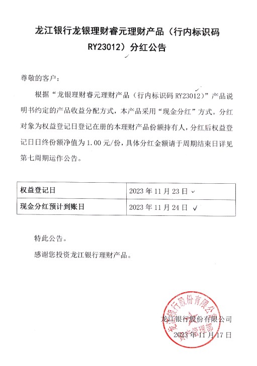 关于龙银理财睿元理财产品(行内标识码RY23012)分红公告
