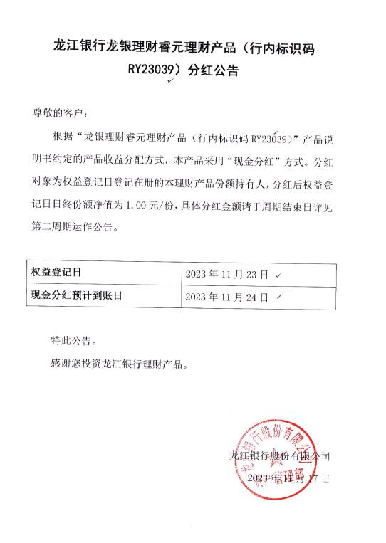 关于龙银理财睿元理财产品(行内标识码RY23039)分红公告