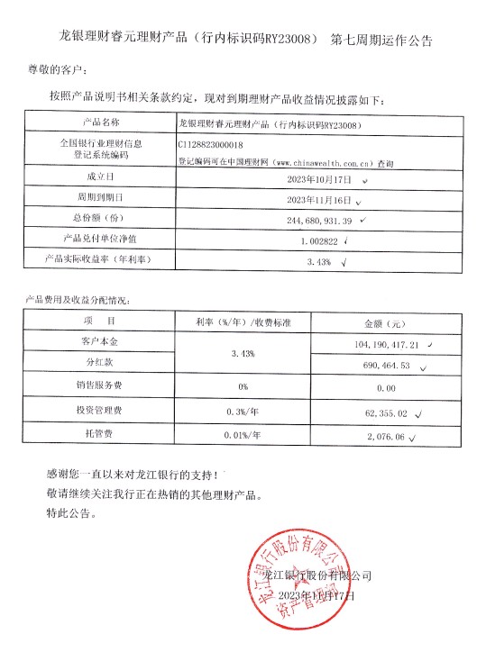 龙银理财睿元理财产品(行内标识码RY23008)第七周期运作公告