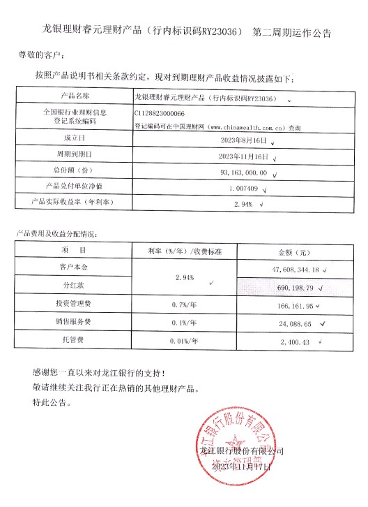 龙银理财睿元理财产品(行内标识码RY23036)第二周期运作公告