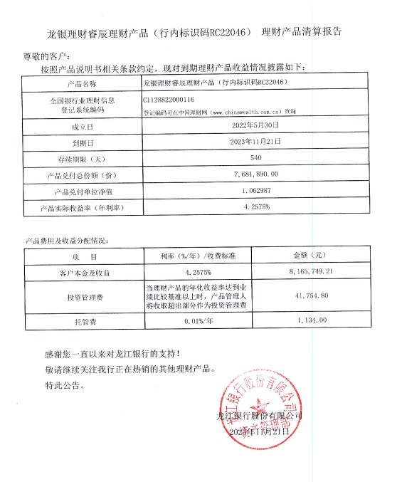 龙银理财睿辰理财产品(行内标识码RC22046)理财产品清算报告