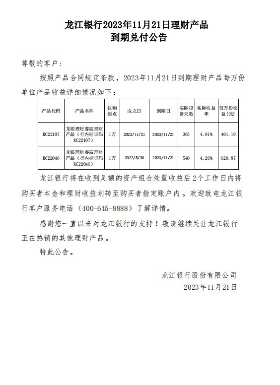 龙江银行2023年11月21日理财产品到期兑付公告