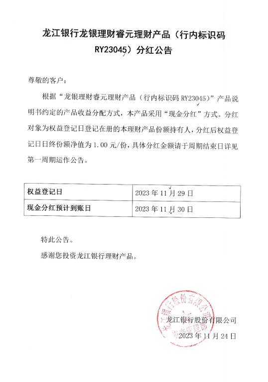 关于龙银理财睿元理财产品(行内标识码RY23045)分红公告