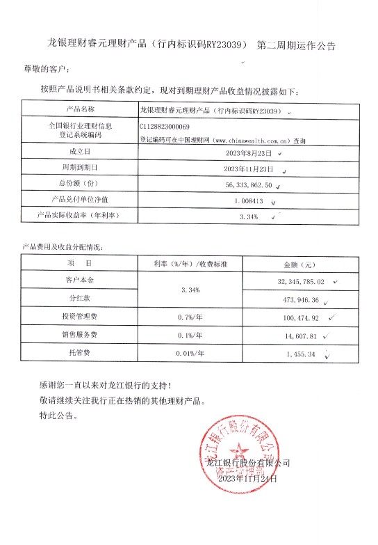 龙银理财睿元理财产品(行内标识码RY23039)第二周期运作公告