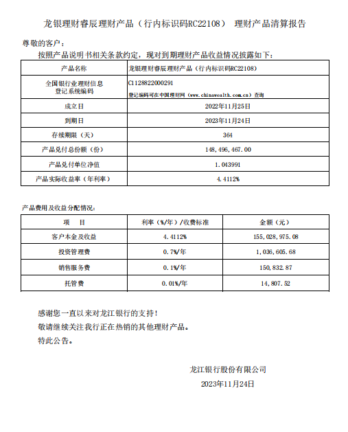 龙银理财睿辰理财产品RC22108号理财产品清算报告