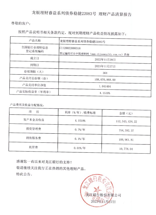 龙银理财睿益系列债券稳健22083号理财产品清算报告