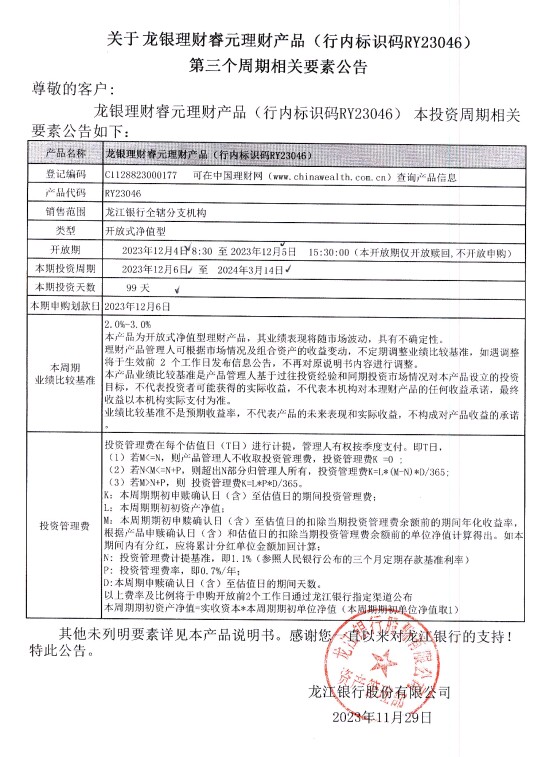 关于龙银理财睿元理财产品(行内标识码RY23046)第三个周期相关要素公告