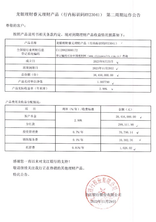 龙银理财睿元理财产品(行内标识码RY23041)第二周期运作公告