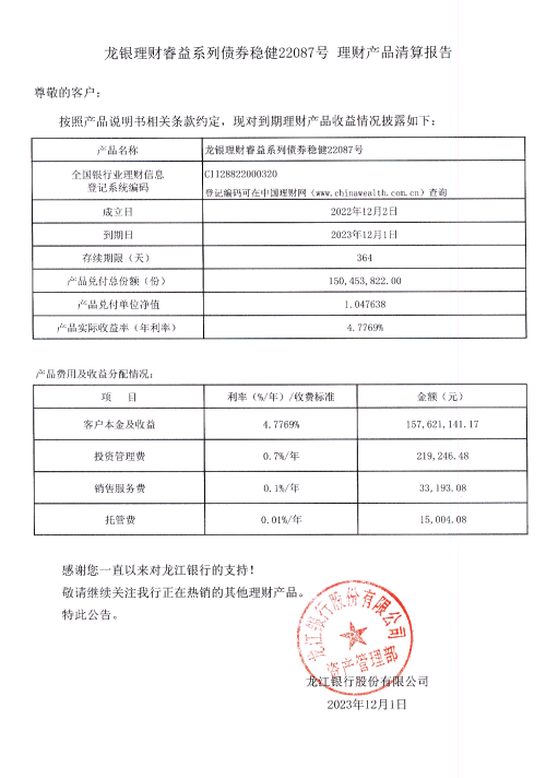 龙银理财睿益系列债券稳健22087号理财产品清算报告