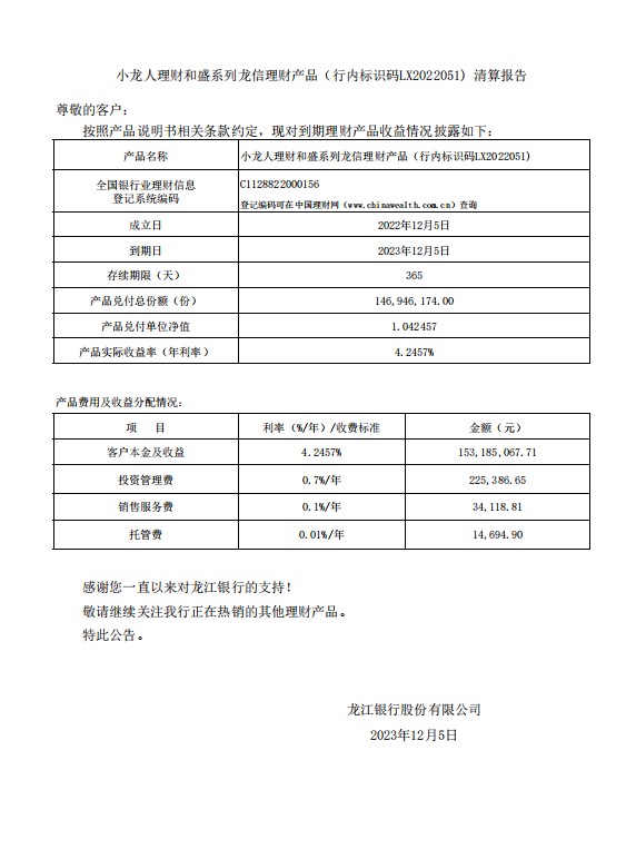 20231205小龙人理财和盛系列龙信理财产品LX2022051清算报告